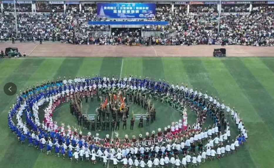 我們看到,比賽前后,有挑著土特產(chǎn)品入場的“啦啦隊”;比賽中場休息時,有侗族大歌、苗族蘆笙舞等極具民族特色的展示;整個比賽過程中,舞者與現(xiàn)場觀眾手拉手跳起多耶舞更是帶動起全場狂歡。