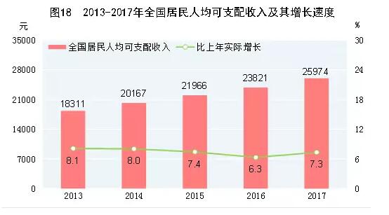 下圖是公報(bào)中的“2013-2017年全國(guó)居民人均可支配收入及其增長(zhǎng)速度”,雖然連年增長(zhǎng),但是到2017年底人均也不過(guò)是25974元。月均2000出頭一點(diǎn)點(diǎn)。