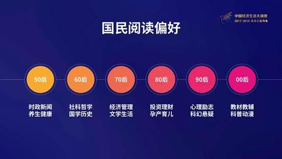 大調(diào)查發(fā)現(xiàn),50后更偏愛時政新聞、養(yǎng)生健康;60后更偏愛社科哲學(xué)和國學(xué)歷史;70后更關(guān)注經(jīng)濟管理和文學(xué)生活;80后更關(guān)注投資理財和孕產(chǎn)育兒;90后更關(guān)注心理勵志和科幻懸疑;而00后則更喜歡教材教輔和科普動漫。