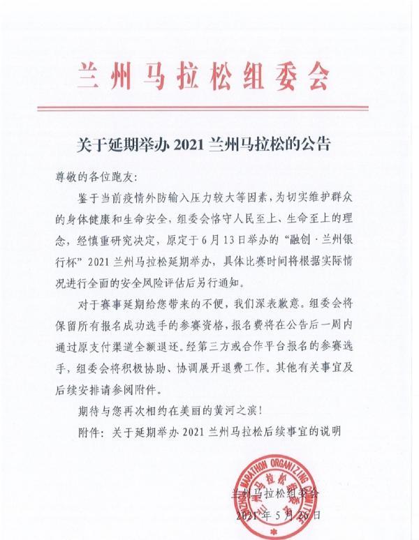 5月26日,蘭州馬拉松宣布,原定于6月13日舉辦的賽事延期,具體比賽時(shí)間另行通知。