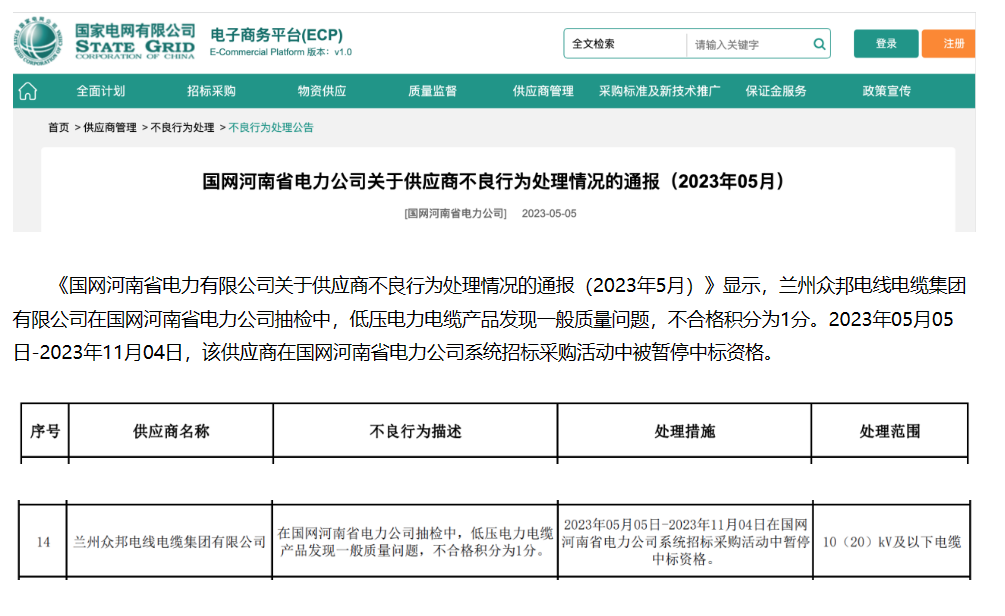 《國網(wǎng)河南省電力有限公司關(guān)于供應商不良行為處理情況的通報(2023年5月)》顯示,蘭州眾邦電線電纜集團有限公司在國網(wǎng)河南省電力公司抽檢中,低壓電力電纜產(chǎn)品發(fā)現(xiàn)一般質(zhì)量問題,不合格積分為1分。2023年05月05日-2023年11月04日,該供應商在國網(wǎng)河南省電力公司系統(tǒng)招標采購活動中被暫停中標資格。