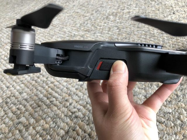 之所以能夠單手開(kāi)機(jī),除了機(jī)身變得纖小,還有就是 Air 的開(kāi)機(jī)鍵在飛行器的“腹部”,也正是在電池上。