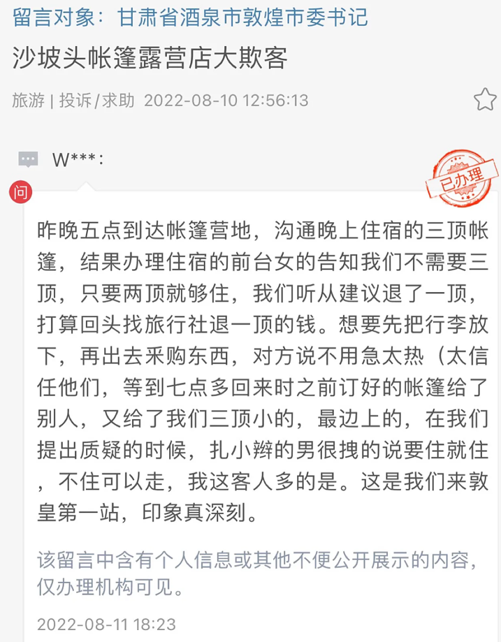 經(jīng)沙漠露營基地管理單位敦煌市莫高鴻杰研學(xué)發(fā)展有限責(zé)任公司對沙坡頭露營基地負責(zé)人約談?wù){(diào)查,反映人所稱與沙坡頭露營基地溝通預(yù)定三頂帳篷導(dǎo)致的糾紛問題屬實,當(dāng)事員工李某服務(wù)態(tài)度不到位的問題確實存在。