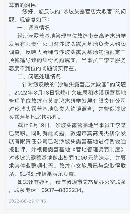 截止8月19日,沙坡頭露營基地當(dāng)事員工李某已離職。同時就此問題,敦煌市莫高鴻杰研學(xué)發(fā)展有限責(zé)任公司已對沙坡頭露營基地進行例會通報批評,并根據(jù)露營基地《營地管理獎罰制度》對沙坡頭露營基地做出處罰1000元的決定,并要求其停業(yè)整頓七天。敦煌市文旅局已與您取得聯(lián)系,您對處理結(jié)果表示滿意。