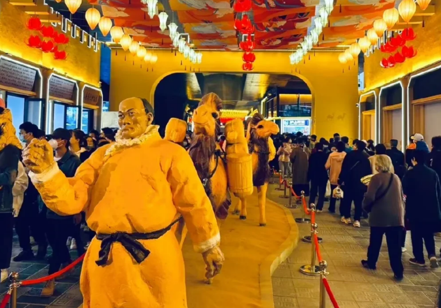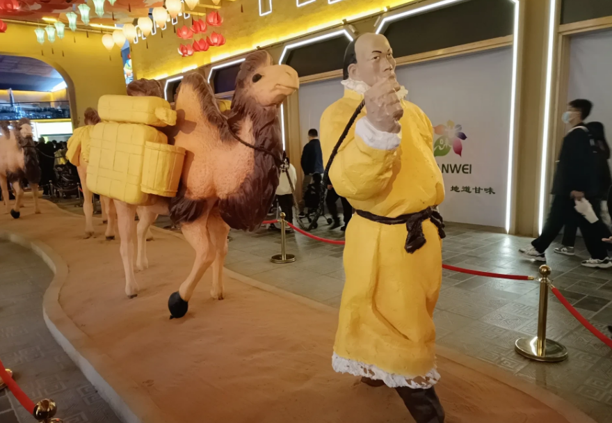 剛進(jìn)入夜市就被眼前壯觀的場(chǎng)景所震撼,夜市內(nèi)部分布呈“T”字形,東西南北長(zhǎng)方形,以街區(qū)特色建筑為主,以時(shí)間和空間為主軸貫穿“絲綢之路”文化主線,打造長(zhǎng)安街、天水隴東街、蘭州街、河西走廊(敦煌)街、西域文化街等5個(gè)絲綢之路節(jié)點(diǎn)城市街區(qū)。據(jù)說(shuō)黃河食渡文化夜市總占地面積約17000平方米,五個(gè)主題街區(qū)共設(shè)立標(biāo)準(zhǔn)化攤位166個(gè),全部采用電烤、電煮、電烹等用電形式運(yùn)營(yíng),無(wú)明火、無(wú)天然氣。