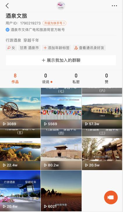 自甘肅文化旅游快手大V培養(yǎng)計(jì)劃實(shí)施以來,酒泉市文體廣電和旅游局按照省文旅廳要求,采取一系列有力措施,迅速開通“酒泉文旅”快手官方賬號,申請注冊了縣(市、區(qū))文旅局、4A級以上景區(qū)、縣(市、區(qū))博物館21家快手大V官方政務(wù)號,推薦上報(bào)33位熟悉網(wǎng)絡(luò)傳播規(guī)律、形象素質(zhì)較好的導(dǎo)游、講解員快手大V,組織建立了酒泉文旅快手大V培養(yǎng)隊(duì)伍。積極組織參加省文旅廳開展的線上“甘肅文旅快手大V培訓(xùn)”,讓更多的景區(qū)景點(diǎn)和博物館的導(dǎo)游、講解員參與其中,把快手平臺作為網(wǎng)絡(luò)宣傳主陣地,積極對外宣傳推介酒泉豐富的文化旅游資源。