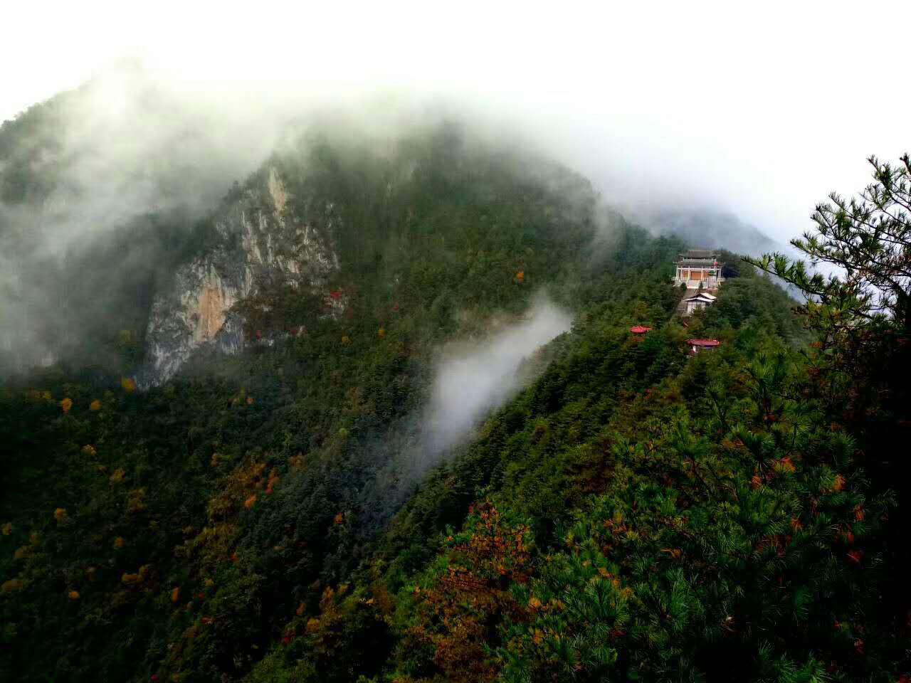 白云山也成為這座小縣城引以為豪的乘興求樂之處。順林間崎嶇小徑,繼續(xù)上行,便至白云山頂。仰望山頂,才知山外有山。西側(cè)的懸崖,層巒迭峰。東、西、北三面,蒼松林立,箭竹叢叢,南面崖石陡峭,似華山仙掌崖一般。