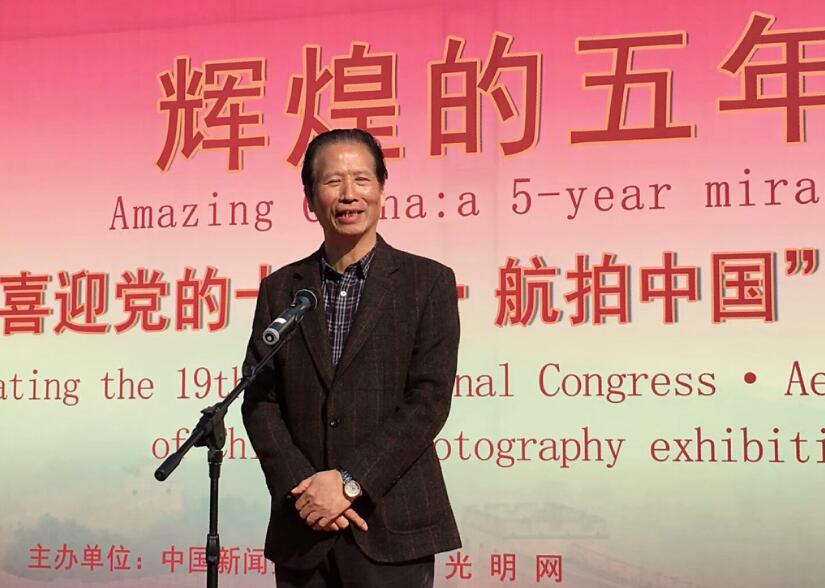 當(dāng)日,位于世紀(jì)壇廣場上的“輝煌的五年——喜迎黨的十九大·航拍中國攝影圖片展”吸引了不少觀眾的注意,該展利用無人機(jī)視角、云平臺技術(shù),在航拍中記錄城市面貌、交通路網(wǎng)、新農(nóng)村的發(fā)展變化,定格十八大以來中國的“升級之美”。一位年近八旬的攝影愛好者孔先生在展區(qū)過道中流連忘返,“這些新設(shè)備新技術(shù)拍出來的片子還真不錯,你看這CBD(中央商務(wù)區(qū))拍出來多好看”。