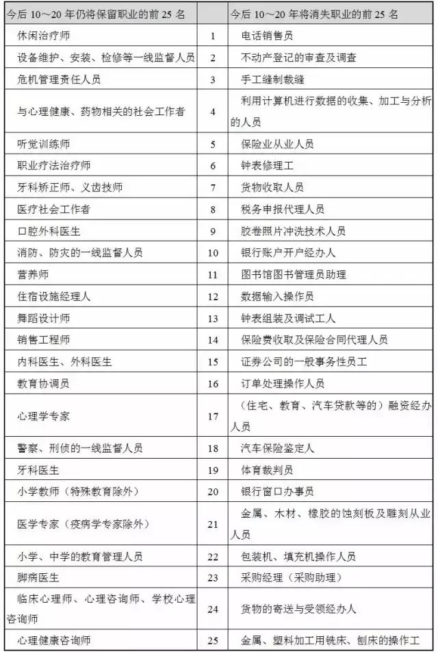 上面提到的十種高危職業(yè),有將近一半是被人工智能取代的,令人不由驚嘆。下面是另外一份報告,來自牛津大學(xué),它列出了今后10~20年將要消失的職業(yè)與將被保留下來的職業(yè)。