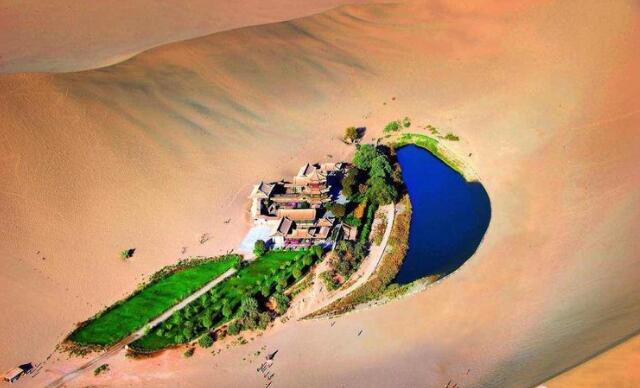 ▼ 攝于2010年。敦煌鳴沙山與月牙泉,這里的泉水也是祁連山滲露過(guò)來(lái)的。文革后期,我來(lái)到這里曾經(jīng)看到:為了可憐的幾百斤麥子的產(chǎn)量,架抽水機(jī)往外抽水澆地。十多年前,月牙泉幾乎干涸,又緊急搶救。
