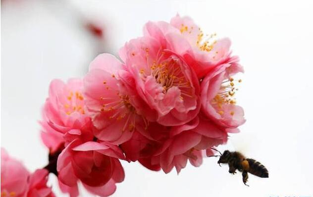 3月1日,一只蜜蜂在貴州省畢節(jié)市倒天河畔的紅梅花叢中采蜜。