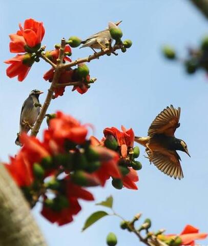3月1日,在海南省三亞市,鳥兒在盛開的木棉花枝間飛舞。