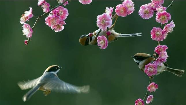 春天,小鳥花枝間嬉戲, 一派春意盎然。