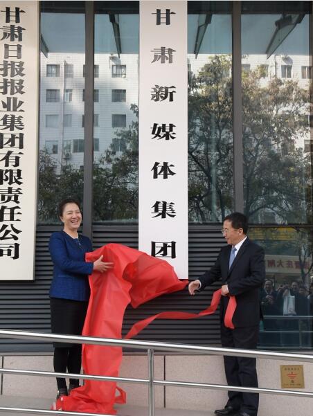 省委常委、省委宣傳部部長陳青與甘肅日報(bào)社黨委書記、社長、甘肅日報(bào)報(bào)業(yè)集團(tuán)董事長王光慶為“甘肅新媒體集團(tuán)”揭牌。
