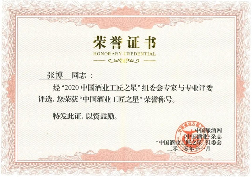 張博(獲“中國酒業(yè)工匠之星”榮譽稱號):國家高級釀酒師、國家一級注冊品酒師、國家質(zhì)量注冊工程師、國家食品安全師,現(xiàn)擔任甘肅紅川酒業(yè)有限責任公司技術副總經(jīng)理。