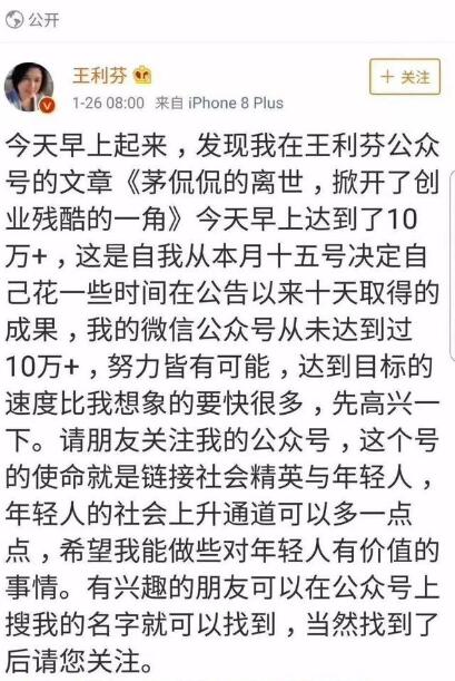 茅侃侃前日被曝離世后,王利芬在其公眾號(hào)撰寫(xiě)文章《茅侃侃的離世,掀開(kāi)了創(chuàng)業(yè)殘酷的一角》,隨后該文章閱讀數(shù)超過(guò)10萬(wàn)。王利芬昨天早上發(fā)微博說(shuō),“這是自我本月十五號(hào)決定自己花一些時(shí)間在公號(hào)以來(lái)十天取得的成果,我的微信公眾號(hào)從未達(dá)到過(guò)10萬(wàn)+,努力皆有可能,達(dá)到目標(biāo)的速度比我想象的要快很多,先高興一下。” 還配上了一張自己工作時(shí)大笑的照片。