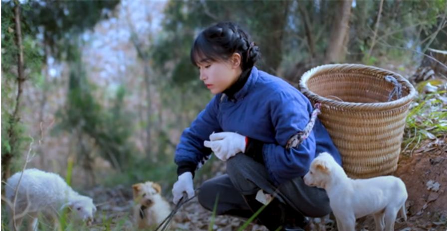 在其中一部視頻里,李子柒在田野勞作時(shí),身旁有小狗和小羊。