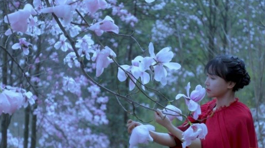 李子柒在采集花瓣時(shí),身穿紅色古裝。