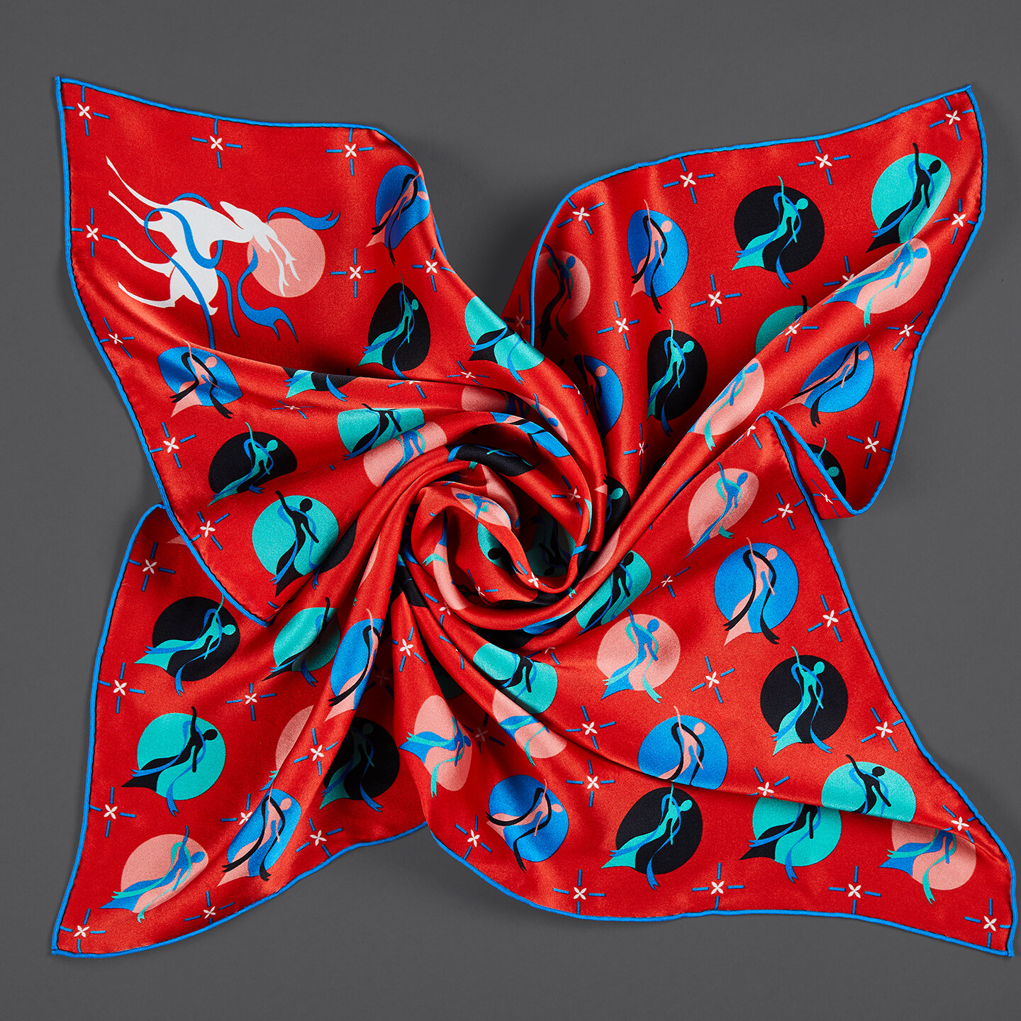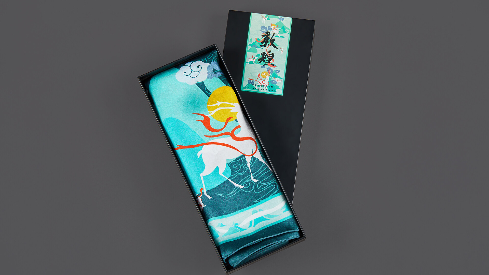 1、絲巾中的九色鹿跳出了原壁畫中的橫卷式構(gòu)圖,在山脈間停留、顧盼、飛奔。