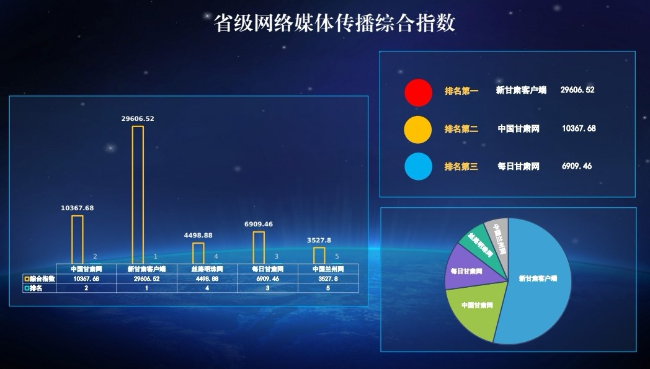 據(jù)了解,此次綜合指數(shù)發(fā)布的時(shí)間區(qū)段為2021年1月1日至2021年9月15日,發(fā)布類別有省級(jí)各新聞網(wǎng)站、客戶端網(wǎng)絡(luò)傳播綜合指數(shù)、駐甘商業(yè)網(wǎng)站平臺(tái)網(wǎng)絡(luò)傳播綜合指數(shù)和全省14個(gè)市州、蘭州新區(qū)網(wǎng)絡(luò)傳播綜合指數(shù)等三類。