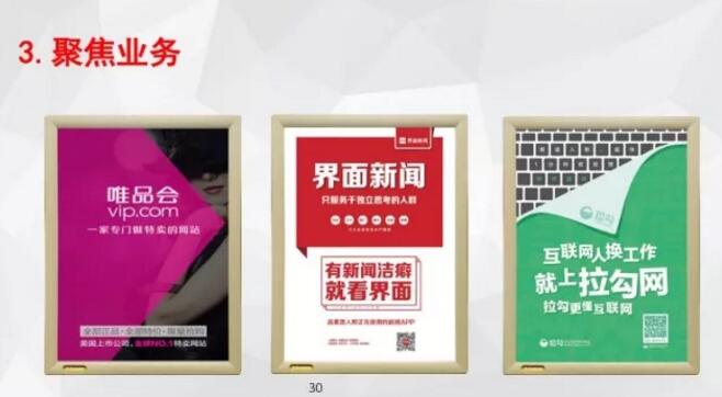 老三打游擊戰(zhàn),占到一個盤踞的地方,越小的領域,越站得住的領域,游擊戰(zhàn)的例子是唯品會,“一個專門做特賣的網(wǎng)站”,只做專業(yè)特賣。這個細分里面做深做專,你清不掉我。