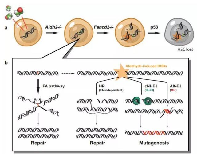 接著就是乙醛導(dǎo)致DNA損傷,并沖破多種DNA修復(fù)系統(tǒng)的大關(guān)。