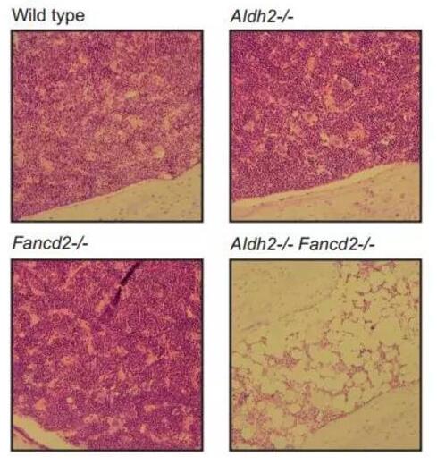 小鼠骨髓區(qū)域的染色圖。接受酒精注射一個(gè)月后,敲除了Aldh2及Fancd2基因的小鼠喪失了造血能力