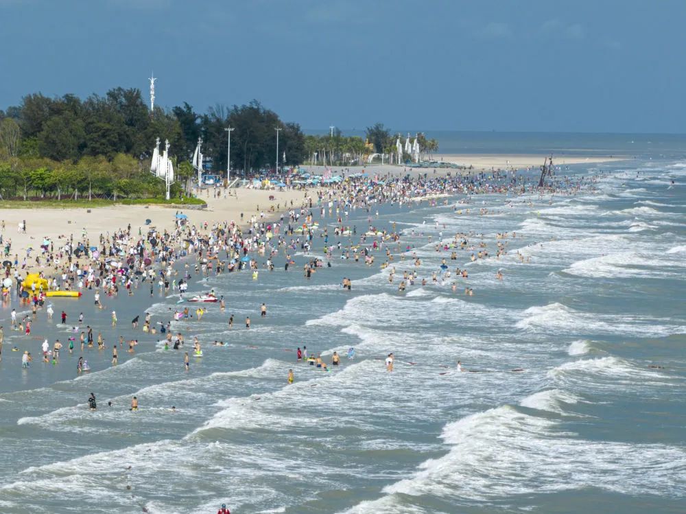 圖為6月22日游客在廣西北海銀灘國家旅游度假區(qū)踏浪休閑。新華社 李君光/攝