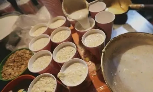 先把牛奶煮一會(huì)加入醪糟,開(kāi)始翻滾時(shí)就準(zhǔn)備往鍋里撒蛋花,蛋花煮旺剛剛成形。還很嫩的狀態(tài)就出鍋,倒入放好白糖八寶的碗中,即大功告成。我的經(jīng)驗(yàn)是:不放糖的味道會(huì)更加突出本味之醇香,為了食客飲用方便及衛(wèi)生,大家現(xiàn)在都改用一次性的大號(hào)紙杯。