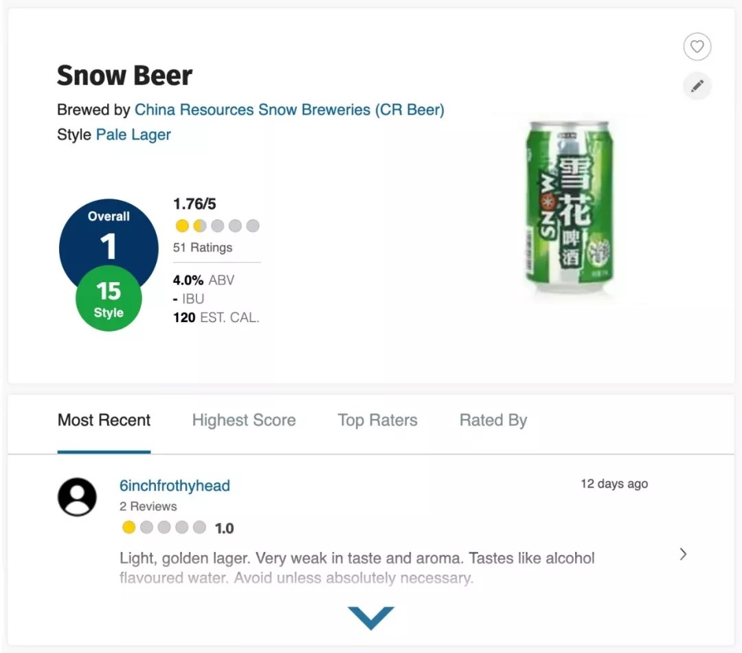 Ratebeer 的總評(píng)分即圖中藍(lán)底的 overall 一項(xiàng),由該類啤酒的消費(fèi)者評(píng)分(即右側(cè) 5 分制評(píng)分)在所有啤酒品類中的排名得出。此外還有一項(xiàng)品類內(nèi)評(píng)分,即圖中綠底的 style 一項(xiàng),由其在品類內(nèi)的排名得出。而這些中國(guó)啤酒即便在較低檔的拉格淡?。≒ale Lager)一項(xiàng)中依然排名靠后。