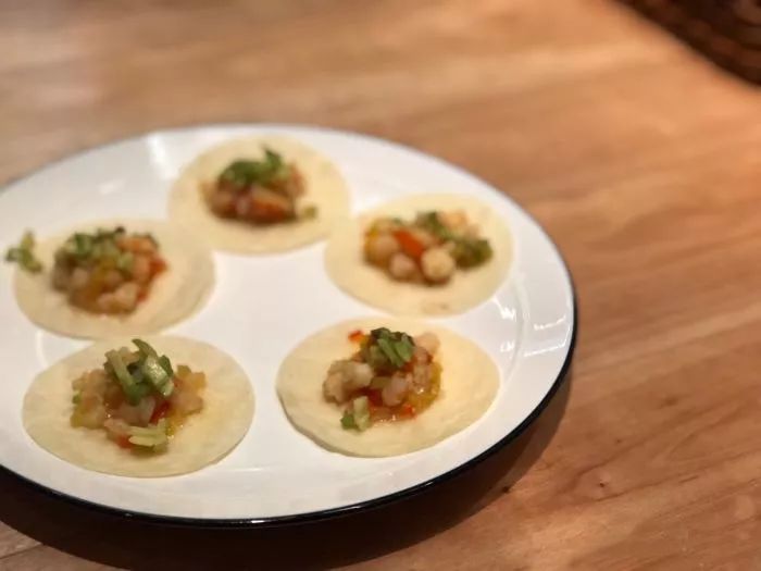 算是一道很特別的料理,手工面皮搭配涼拌蝦仁、辣椒、蒜片等材料,加點鮮香牛油果點綴,有點像是塔克的做法。