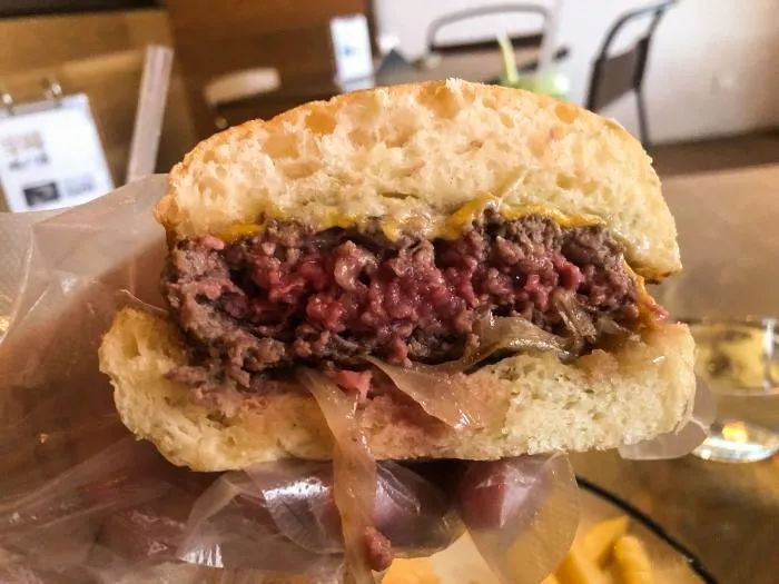 其實就是漢堡中間夾了塊霉菌制成的奶酪,聞起來有點臭,但是吃起來很棒,有很濃郁的芝士味道。