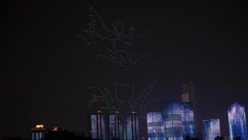5月25日晚,“紀(jì)念袁隆平院士”無人機(jī)編隊(duì)飛行活動(dòng)在廣東省廣州市海心沙廣場(chǎng)上空舉行。圖為無人機(jī)編隊(duì)組成袁隆平院士樣貌的圖案。