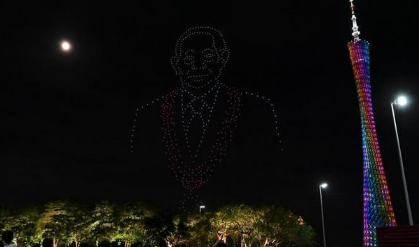 5月25日,無人機(jī)拼出袁隆平樣貌。當(dāng)晚,湖南長(zhǎng)沙上空數(shù)百架無人機(jī)編隊(duì)飛行,在夜空中不停變換,再現(xiàn)“雜交水稻之父”袁隆平樣貌。