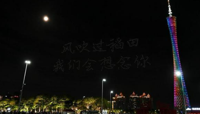 5月25日晚,“紀(jì)念袁隆平院士”無人機(jī)編隊(duì)飛行活動(dòng)在廣東省廣州市海心沙廣場(chǎng)上空舉行。圖為無人機(jī)編隊(duì)組成“風(fēng)吹過稻田 我們會(huì)想念你”字樣。 (來源:中國(guó)新聞網(wǎng))