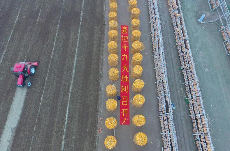 2017年10月15日,在山東聊城市茌平縣賈寨鎮(zhèn)大鄭莊村,祥豐糧食種植專業(yè)合作社種糧大戶鄭殿林和來此進行社會實踐調(diào)研的聊城大學(xué)美術(shù)學(xué)院學(xué)生們用玉米在紅地毯上擺出“喜迎十九大勝利召開”字樣。