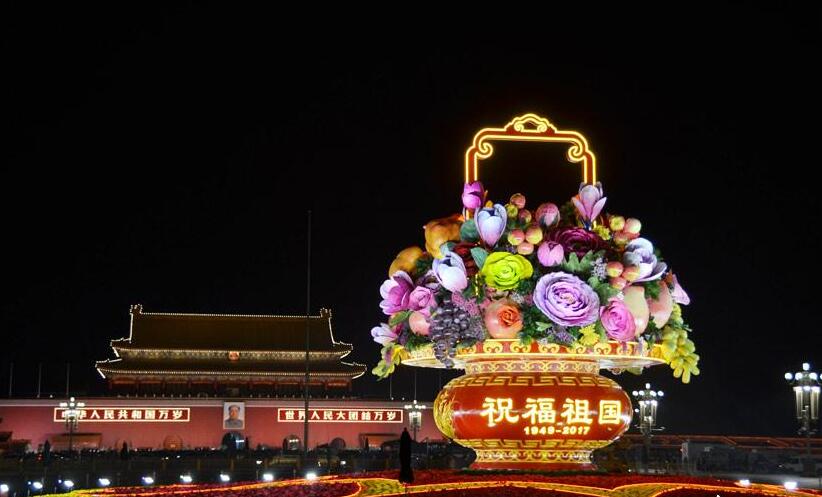 “祝福祖國 喜迎十九大”大水果花籃矗立在天安門廣場 (攝影/崔永紅)