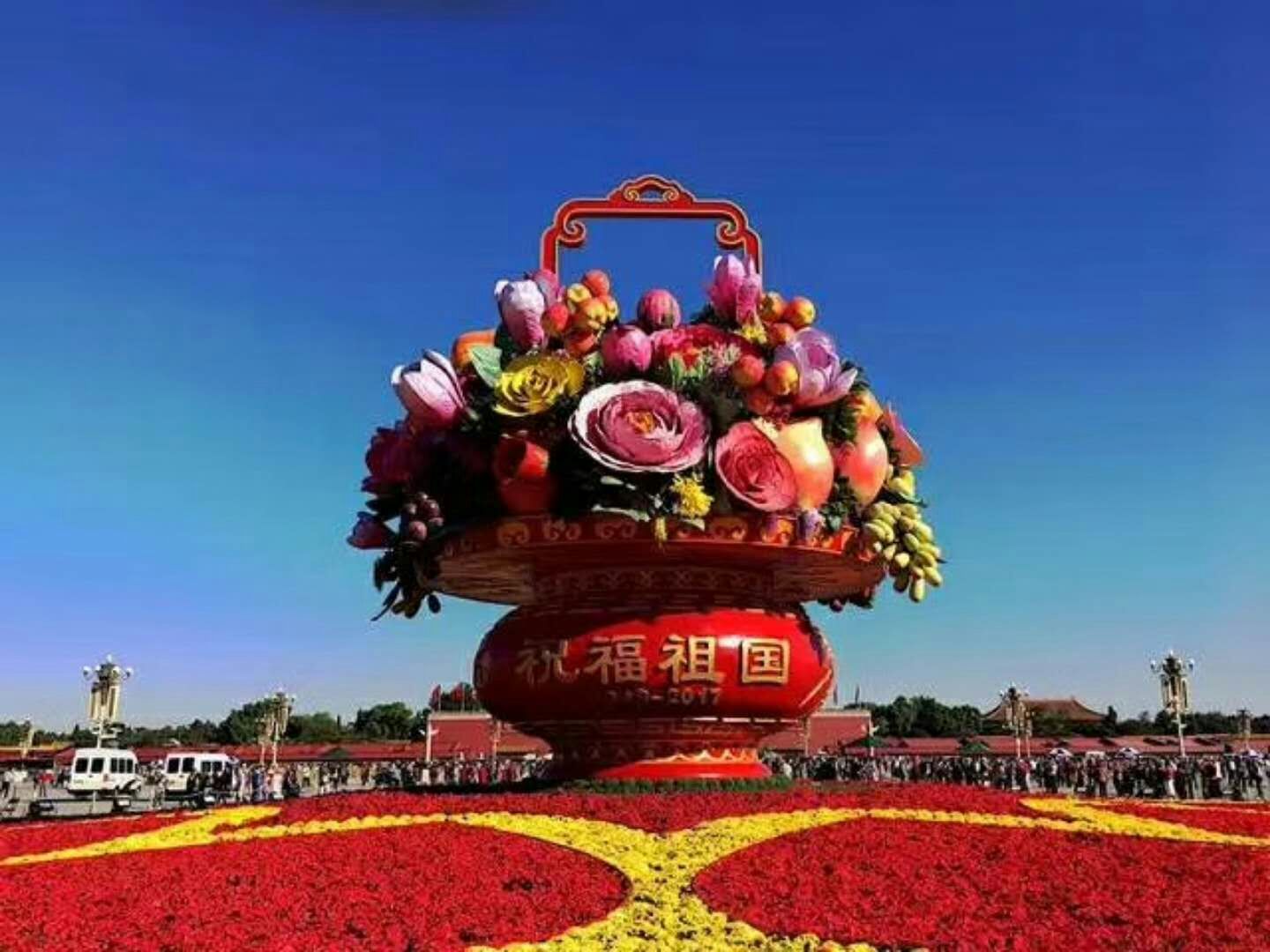 在花盤的北側(cè),是玻璃鋼制成的紅色籃體。整個花籃頂高17米,籃體高15.3米,底部直徑達50米。今天白天,籃體上“祝福祖國,1949—2017”、“喜迎十九大”幾個大字也將安裝完成。屆時,花壇的“真容”將逐步顯現(xiàn)出來。