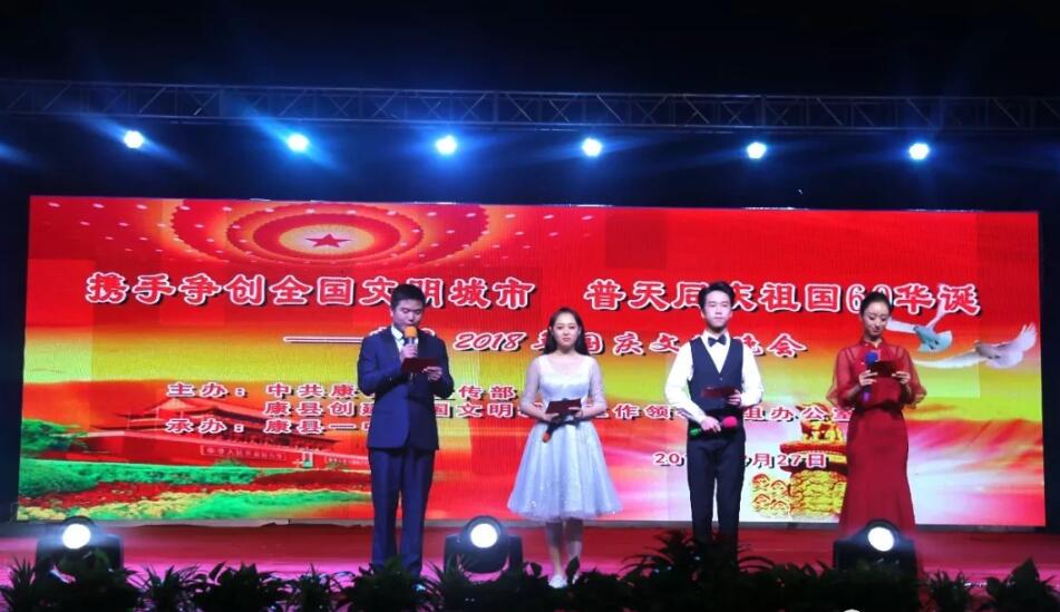 2018年9月27日晚,由中共康縣委宣傳部、康縣創(chuàng)建全國(guó)文明城市工作領(lǐng)導(dǎo)小組辦公室主辦,康縣一中承辦的主題為“攜手爭(zhēng)創(chuàng)全國(guó)文明城市,普天同慶祖國(guó)69華誕”康縣2018年國(guó)慶文藝晚會(huì)在市政廣場(chǎng)隆重舉行??悼h四大班子領(lǐng)導(dǎo)與現(xiàn)場(chǎng)1000余名各界群眾歡聚一堂,共慶祖國(guó)母親69華誕。