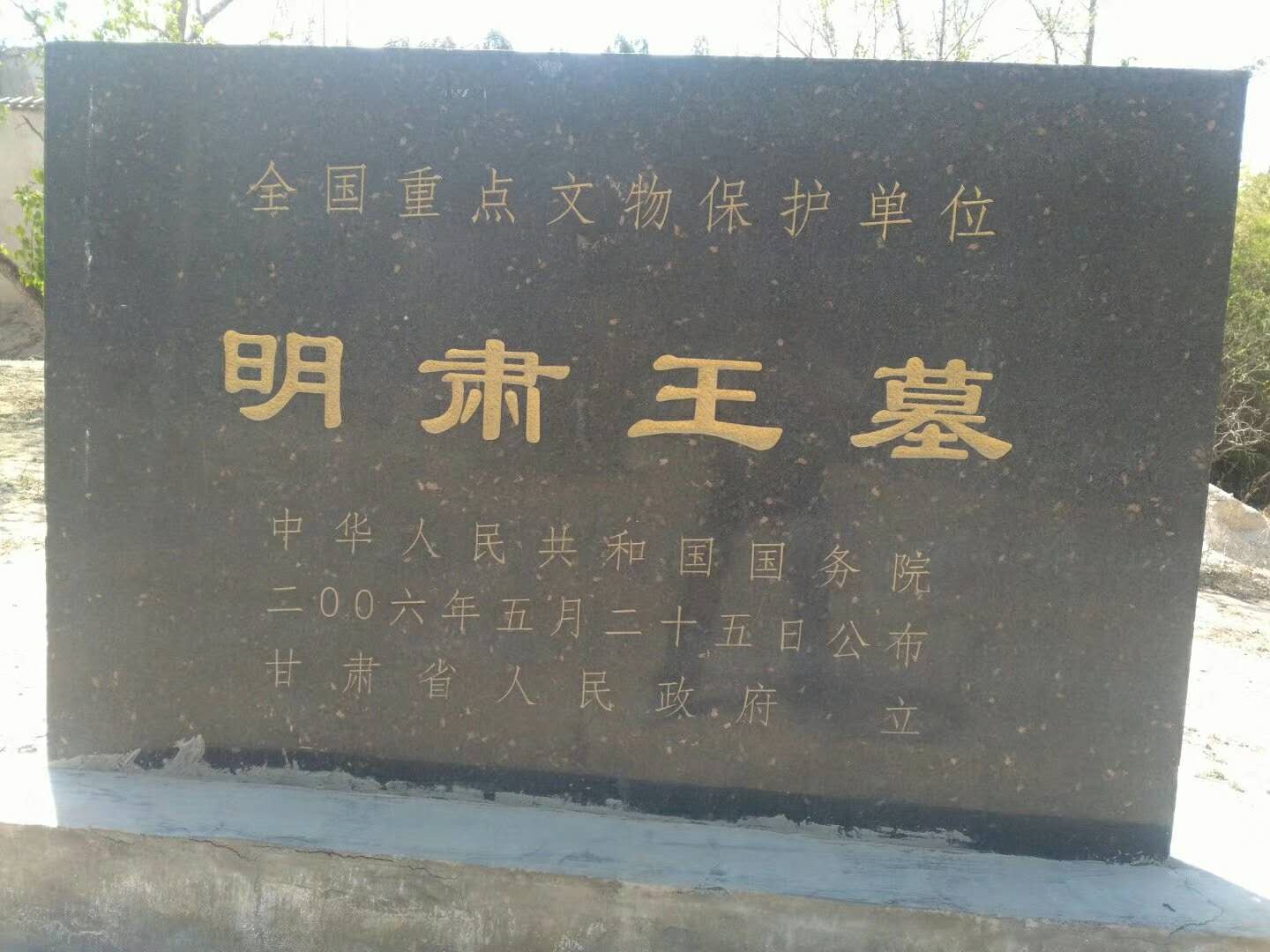院內(nèi),有硬化的路面通向小山崗。路南是懸崖,崖下是農(nóng)戶的莊院,路北有較平坦寬敞的土地,種有槐樹、果樹、楊樹、榆樹等。有些樹已枯死,看來已有好長時間沒有澆水了沿硬化的路行進(jìn)100米??吹搅艘粔K甘肅省人民政府立的全國重點文物保護(hù)單位‘明肅王墓’”黑色水泥碑,上刻有明肅王墓的簡介。