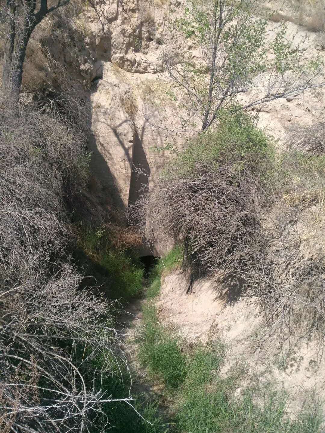 沿小道走了100余米,右側(cè)30米處,似有墳冢土包,前往觀看,果然是一處墳冢。土包的南面,有陡峭的墓道,隱約能看到墓穴的門,雙扇門框內(nèi),只有一扇門。沒有燈光,也沒有看護(hù)人員,因此沒有下墓道觀看。