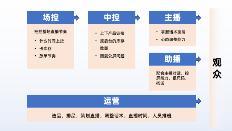 運(yùn)營:選品、排品,策劃直播,調(diào)整話術(shù)、直播時(shí)間、人員排班等。