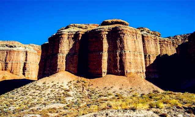 隨著越野車繼續(xù)前行,地貌又有了不同變化。在火星谷神鷹峽內(nèi),分布著連綿十余公里的柱狀沙礫巖,與周圍山體和草原的色彩對比非常強烈,當?shù)厝诵蜗蟮胤Q其為“天下糧倉”、“千佛崖”。