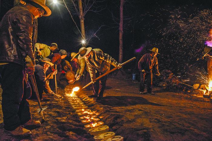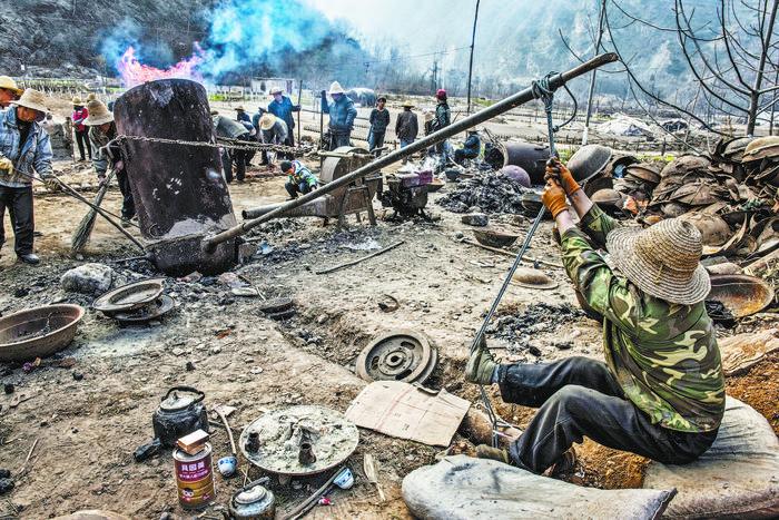 眼前這形狀神似燕尾的鏵,并不像我們想象的那樣,是由工匠在傳統(tǒng)的鐵匠鋪里鍛打而成,雍壩人生產(chǎn)的場地更夸張,村頭江邊的空地變成了一個偌大的生產(chǎn)車間,幾百人集體出動、密切協(xié)作,機(jī)器轟鳴,爐火升騰,進(jìn)料的、揚(yáng)爐的、撥碴的、取火的、出鏵的……男女老少齊上陣,吃飯喝水在工地,這樣熱鬧而忙碌的勞動場景讓人目瞪口呆。