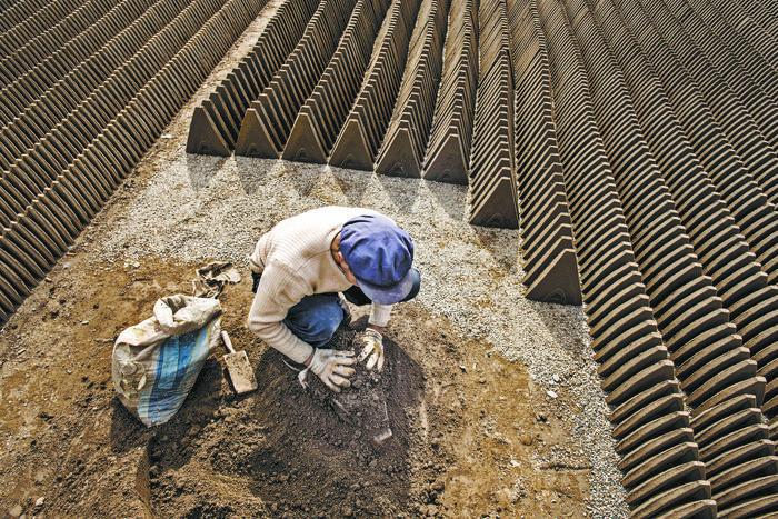 “出鏵”的感覺有如從田間地頭壘的“地窩子”里抓已經(jīng)燒熟的土豆,此時一人在沙窖邊挖鏵模,一人帶著手套對尚未冷卻、冒著熱氣的鏵模,猛然抓住并迅速摔離沙窖,看著著實(shí)讓人心驚膽戰(zhàn)。撿鏵則有種豐收的喜悅,看他們?nèi)迦擞描F耙、鐵釣、鐵棍等工具從破碎的鏵模中將鏵刨撿出來,并把它們碼放整齊。