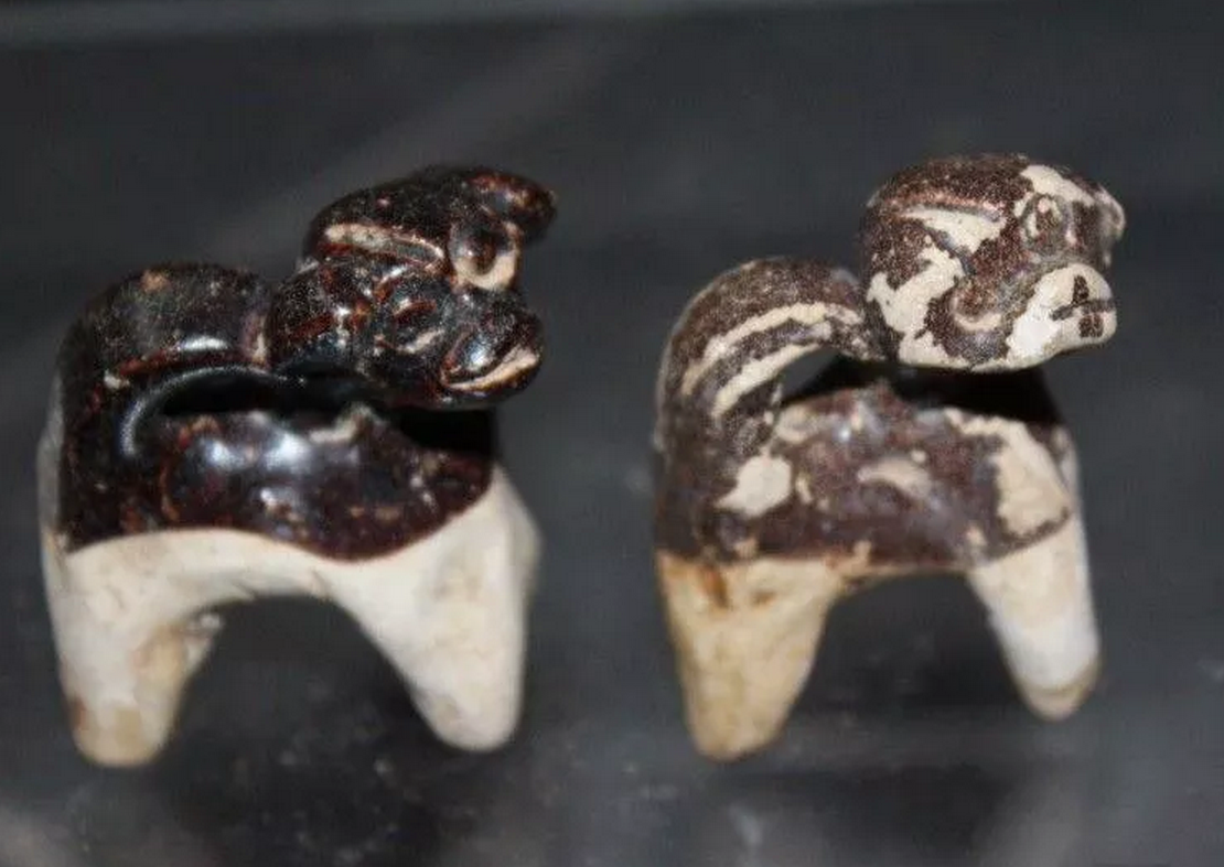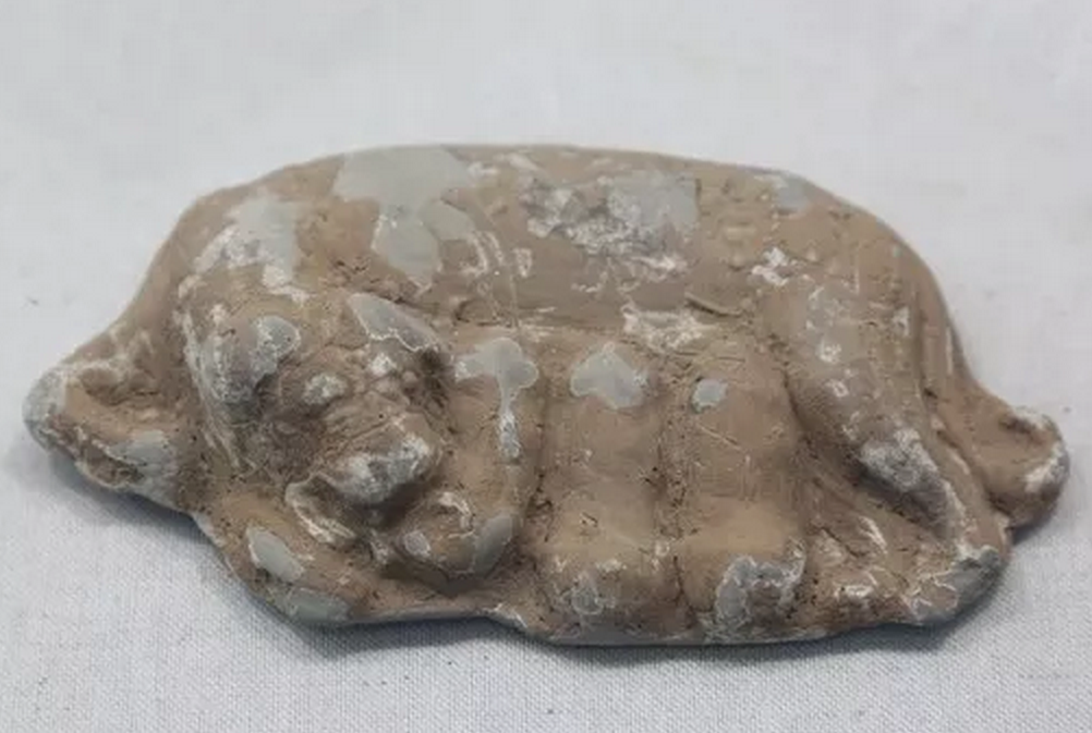 北齊陶臥狗。泥土附著導(dǎo)致無法看出這件器物的本來面貌。一個狗媽媽喂哺著三只小奶狗,回頭望的憐愛的眼神,寵溺的神情,滿滿的都是母愛??!小奶狗圓滾滾的身形為這件器物平添了許多趣味。
