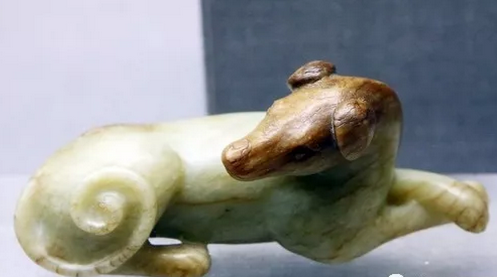 唐代玉臥狗。利用玉石本身的顏色制成褐色頭部、白色身軀的玉狗,刻劃得精致、傳神。狗神態(tài)放松,前肢自然交叉,回頭靜望,尾巴自然卷曲。這應(yīng)該是用作把玩的物件??纯慈思疫@優(yōu)雅的姿勢,這銷魂的回眸,這漂亮的毛色,連尾巴卷成的卷都那樣好看!狗中貴族!