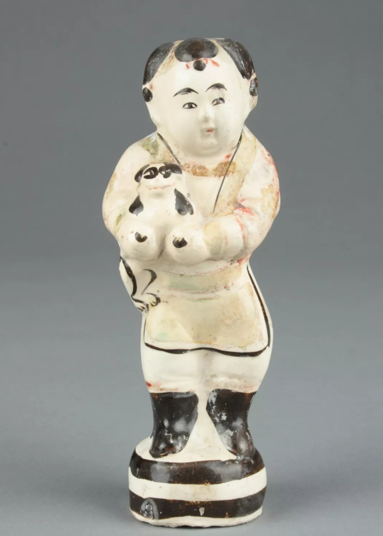 金磁州窯抱狗男童俑,通高16厘米。這件瓷俑懷里抱著一只黑白花的小狗,雙手緊握小狗的兩只前爪,非常生動有趣。