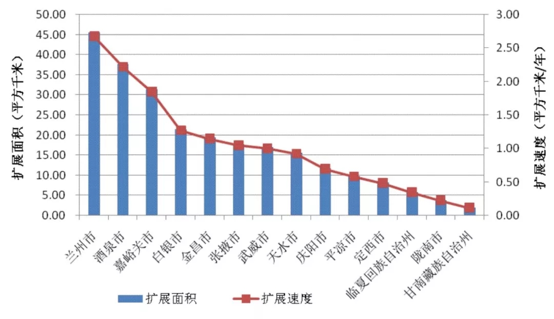 從2000年以來,甘肅省地級城市空間擴展明顯,全省地級城市17年間的平均擴展速度為1.04平方千米/年。從各城市間相互比較看,蘭州市、酒泉市、嘉峪關(guān)市為高速擴展城市,這三個城市的平均擴展速度是全省平均擴展速度的2.2倍,其中蘭州市共擴展45.62平方千米,酒泉市擴展37.77平方千米,嘉峪關(guān)市擴展31.37平方千米;白銀市、金昌市、張掖市、武威市、天水市為中速擴展城市,基本上是以全省平均速度在進(jìn)行擴展;定西市、平?jīng)鍪?、慶陽市為低速擴展城市,平均擴展速度大約是全省平均速度的二分之一;臨夏回族自治州、隴南市、甘南藏族自治州為緩慢擴展城市,甘南藏族自治州只擴展了1.93平方千米, 隴南市擴展了3.86平千米,臨夏回族自治州擴展了5.86平方千米。
