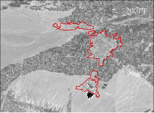 從酒泉市歷史影像可以看出,酒泉市肅州區(qū)地處河西走廊中西部,境內(nèi)無山,平坦開闊,除北方向受北大河限制以外,其他方向無發(fā)展阻力,城區(qū)總體上呈西、西南向擴張的趨勢,尤其是西向擴張量最多,擴展面積最大;其次是西南方向。